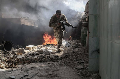 Outra vez o apito. É uma tragédia. Um segundo e regressam, com ódio, agitando-se e bramindo, os sons da guerra. Era um forte, eficaz porque inesperado, contra-ataque adversário. O inimigo era fortíssimo, bravíssimo, quase imbatível na determinação por que se deixava animar. Passam-se uns minutos de incerteza, de clamor, de posições que se perdem e se recapturam para logo se perderem novamente. O objecto dos terroristas, o seu propósito, é encerrar ali a companhia e S., cercá-los e supliciá-los a todos. Engendram-se, para serem repelidos uma e outra vez, os esforços de reabertura da rua que os levaria a posição segura. Do outro lado, a menos de um quilómetro, os camaradas que os ouviam tentavam o mesmo. É empresa difícil, pois encontram-se bem armados, treinados e municiados os que se lhes opõem. A uns metros, têm um contingente da Frente da Vitória, reencarnação da desaparecida Frente Al Nusra e, logo, filha da Al Qaeda.